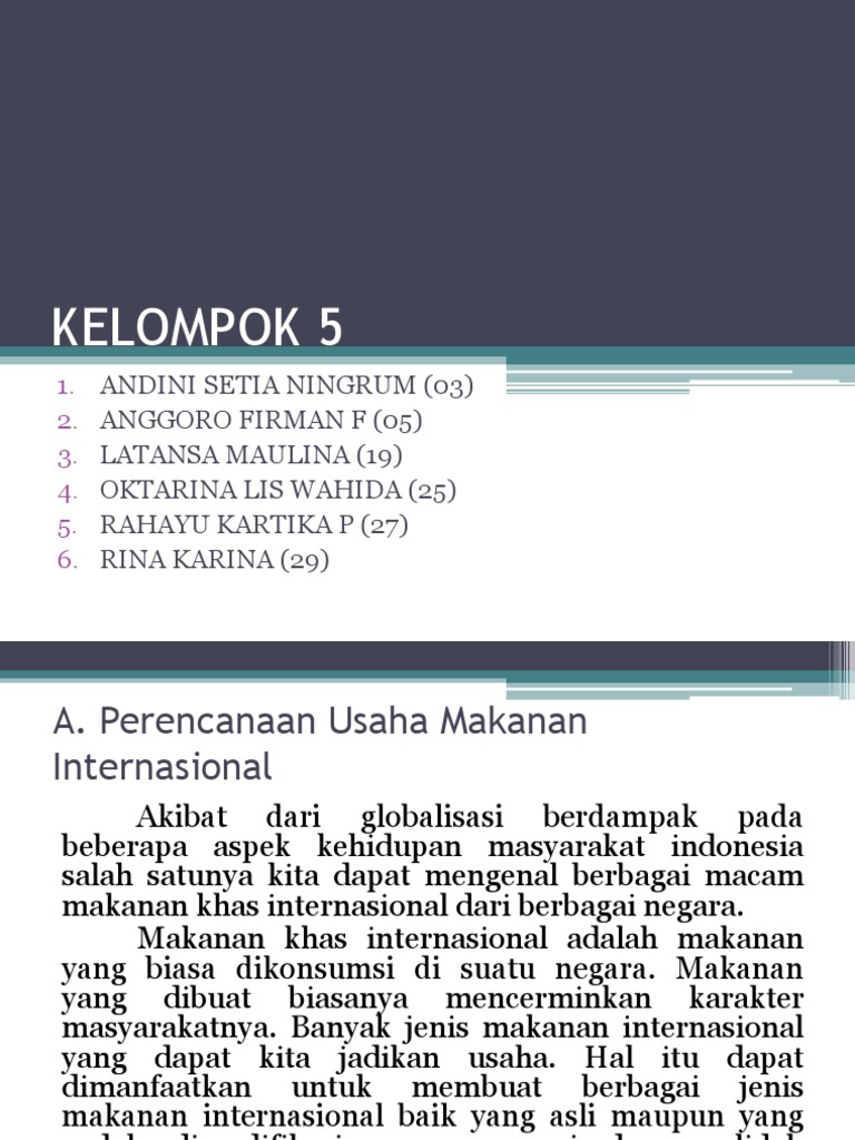 / Rencana Usaha Makanan Internasional Berdasarkan Segmentasi Pasar / Pengolahan Dan Kewirausahaan Bahan Nabati Dan Hewani Menjadi Makanan Internasional Suara Kresek : Rencana usaha makanan internasional berdasarkan segmentasi pasar.